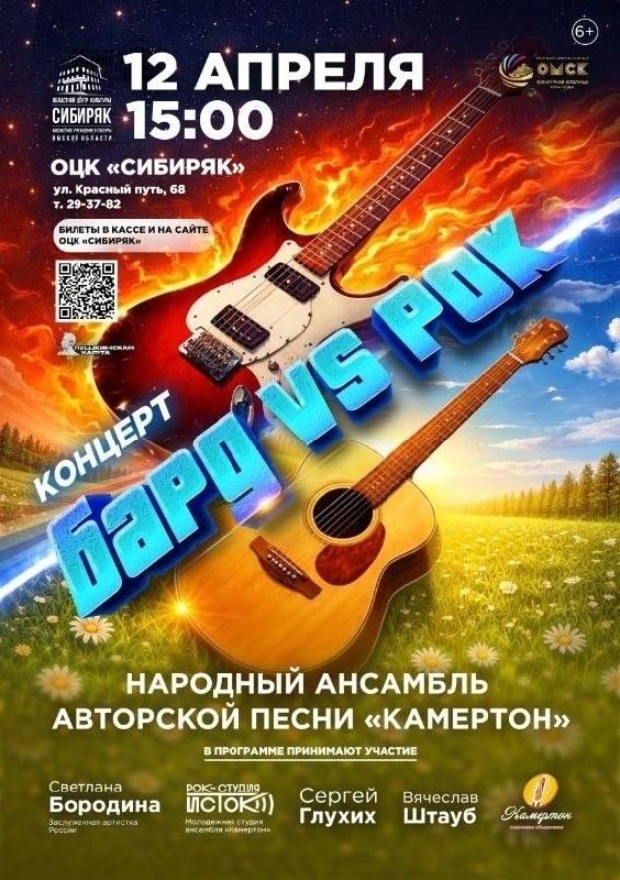Уникальное культурное событие, объединяющее авторскую песню и рок-музыку. В программе участвуют народный ансамбль Камертон, молодёжная студия, рок-студия Исток и приглашённые артисты. Начало: 12 апреля 2026 15:00 Стоимость: Не указана Адрес: г Омск, ул Красный Путь, д 68 Организатор: https://vk.com/public115943919 Утро в Культурной столице! #Сибиряк_приглашает 🎸12 апреля в 15.00 в Областном центре культуры «Сибиряк» состоится отчётный концерт народного ансамбля авторской песни «Камертон» «Бард vs рок». 🎸Приготовьтесь к уникальному культурному событию, которое разрушит жанровые стереотипы. На одной сцене встретятся два мощных пласта музыкальной культуры: доверительная искренность авторской песни и неудержимая энергия рока. Программа «Бард vs Рок» —... #развлечения_современная_музыка Узнать подробности, адрес или записаться на событие.