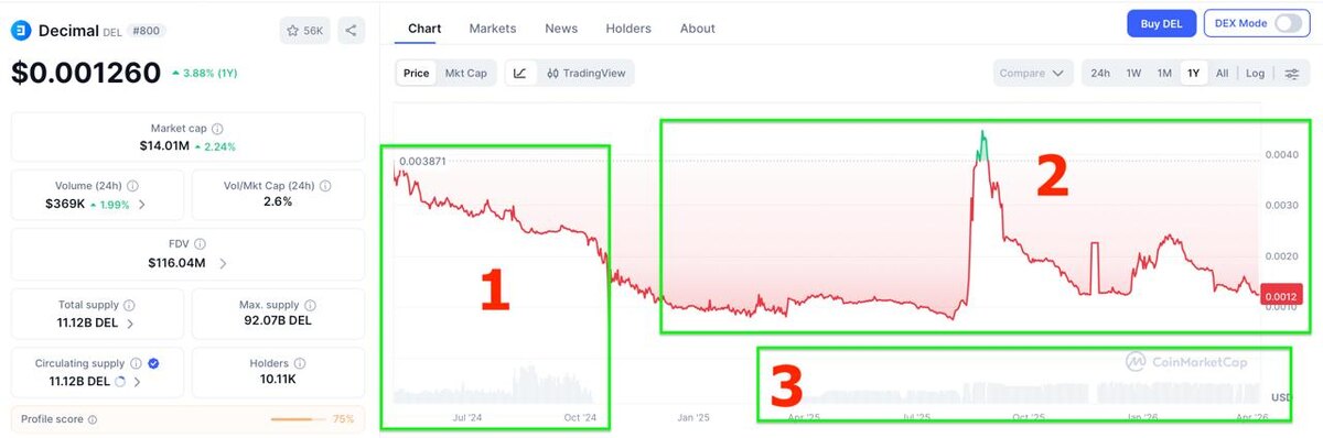 ) Теперь давайте посмотрим на более свежий участок графика с мая 2024 года. Именно здесь уже начинается реальная картина того, что происходит. 🖤До октября 2024 года цена ещё продолжала снижаться, но важно другое - характер этого снижения начал меняться. Давление продавцов ослабевало, движение вниз становилось всё менее агрессивным. Это классический признак того, что актив постепенно “выжимают” до минимальных значений. Дальше начинается самое интересное. 🖤С ноября 2024 года формируется боковик - фаза накопления. Цена перестаёт активно падать и начинает двигаться в узком диапазоне. Для большинства это выглядит как “ничего не происходит”, но для тех, кто понимает рынок, это ключевая зона. И уже к июлю 2025 года происходит резкое движение вверх - рост до +500% от нижних значений. Что это означает на практике? Те, кто заходил на “дне”, получили возможность кратно увеличить свои позиции. Даже без идеального входа, просто покупая в зоне низких значений, можно было зафиксировать серьё