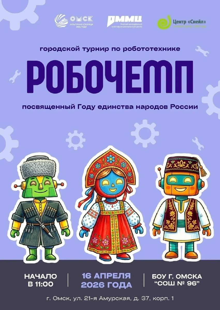 Приглашаем юных инженеров на городской турнир по робототехнике «Робочемп»! Участники создадут и запрограммируют роботов для скоростных гонок в номинациях «РобоТяга», «Сумо» и «РобоФокс». Регистрация открыта до 13 апреля. Начало: 16 апреля 2026 11:00 Стоимость: Не указана Адрес: г Омск, ул 21-я Амурская, д 37 к 1 Организатор: https://vk.com/public85542843 Успейте зарегистрировать свою команду! Приглашаем юных инженеров на городской турнир по робототехнике «Робочемп»! 16 апреля в 11:00 в школе №96 (ул. 21-я Амурская, 37, корпус 1) участники создадут и запрограммируют роботов для скоростных гонок. Номинации: - «РобоТяга» (до 12 лет) — с использованием Lego WeDo 2.0. - «Сумо» (7–13 лет) — с использованием Lego EV3. - «РобоФокс» (3–6 классы)... #личностный_рост_сообщества Узнать подробности, адрес или записаться на событие.