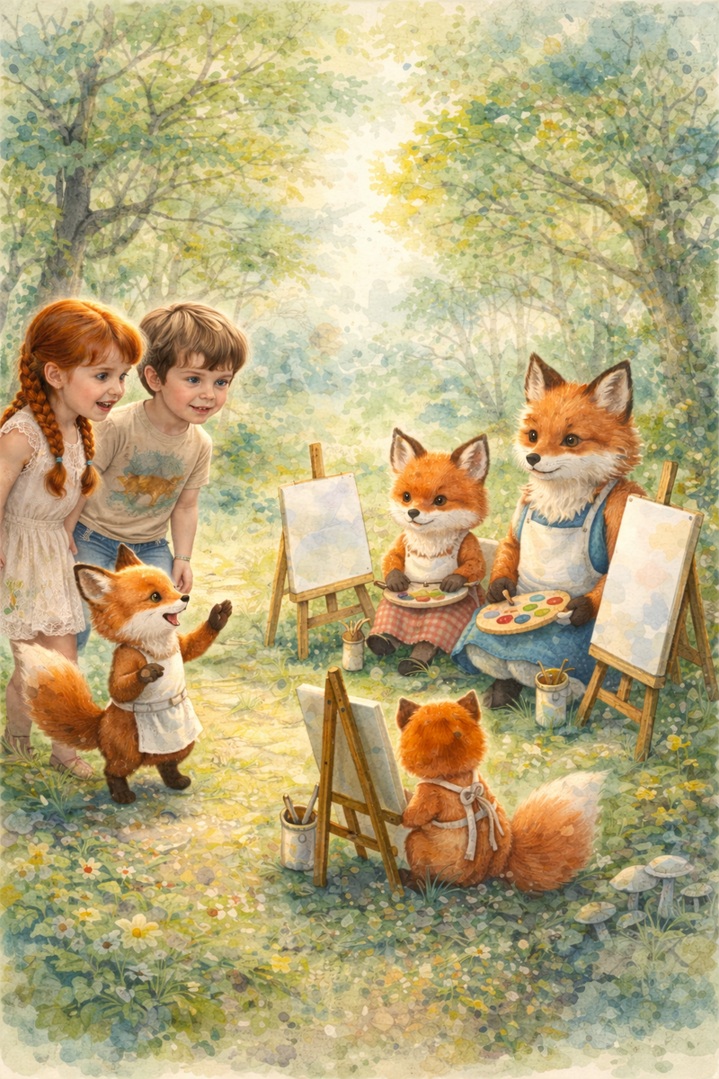 — Здравствуйте, здравствуйте! — затараторила самая маленькая лисичка, подбегая к детям. Хвост у неё был кисточкой — настоящей художнической кисточкой. — А мы вас ждали! Я — Рыжик. Это моя мама — Лисица Ириска, а это папа — Лис Вереск. И ещё наши ученики.