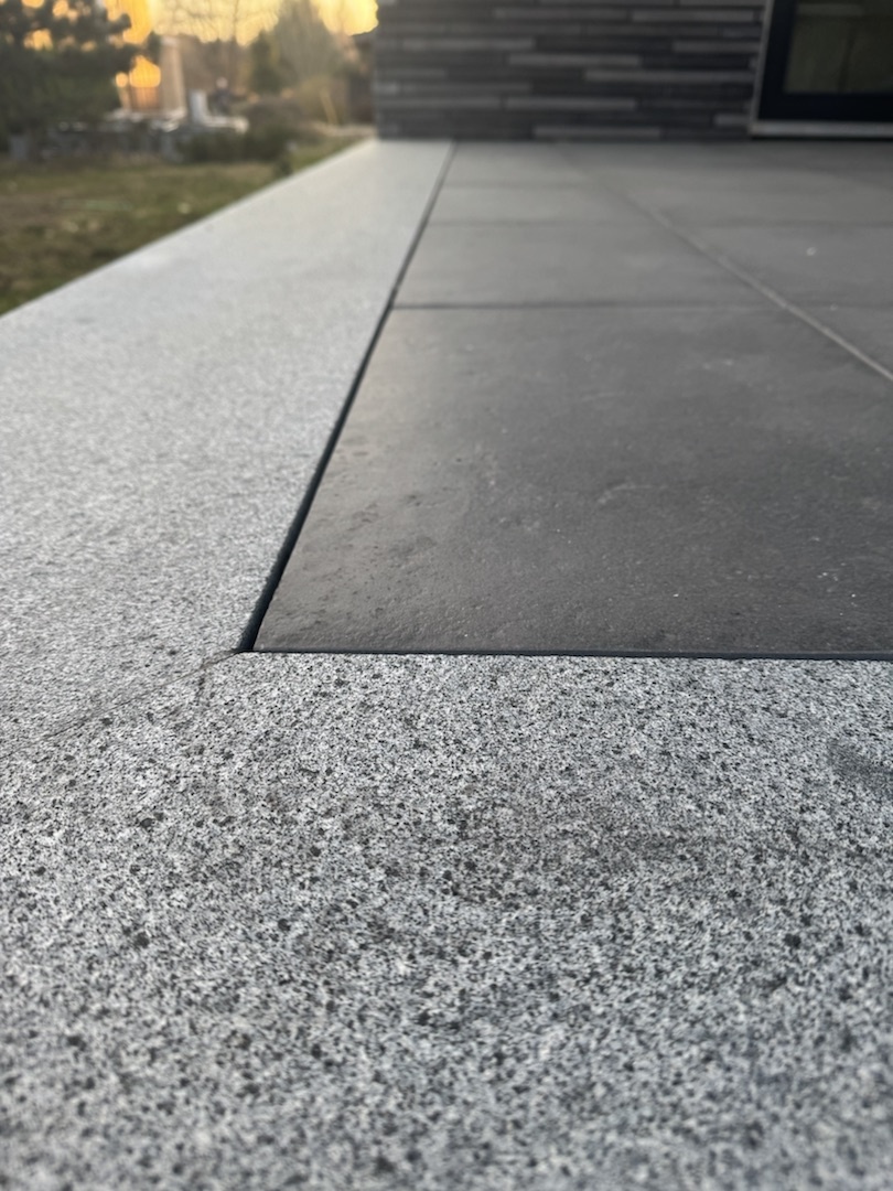 Здесь использовали утолщенный керамогранит в основной плоскости и натуральный камень по периметру. Камень работает как обрамление и визуально собирает композицию, добавляет глубины. Отдельное внимание — к стыку материалов. Аккуратный зазор не только технически необходим, но и подчеркивает разницу фактур: матовый керамогранит и более «живой» натуральный камень. Такие решения хорошо показывают, как за счет деталей можно сделать террасу не просто практичной, а действительно выразительной. Поможем подобрать сочетание материалов под ваш проект! ➡️ unimart24.ru 📲 +7 (495) 118-39-52 📩 info@unimart24.ru