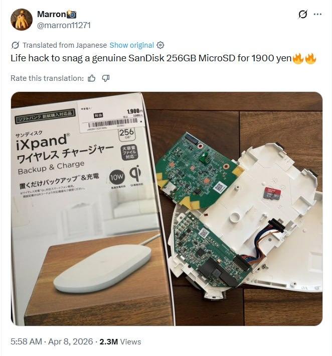 ! 💰 Ему не нужно было само устройство, а лишь его "начинка". Он извлек из зарядки карту памяти SanDisk MicroSD на 256 GB. В итоге, ему это обошлось всего в 1900 йен, или около 950 рублей, в то время как сама карта памяти стоит значительно дороже. "Он просто гений!" Но возникает вопрос: зачем вообще SD-карта в зарядке...? 😐 Новое для тебя 👉@mikenimoff