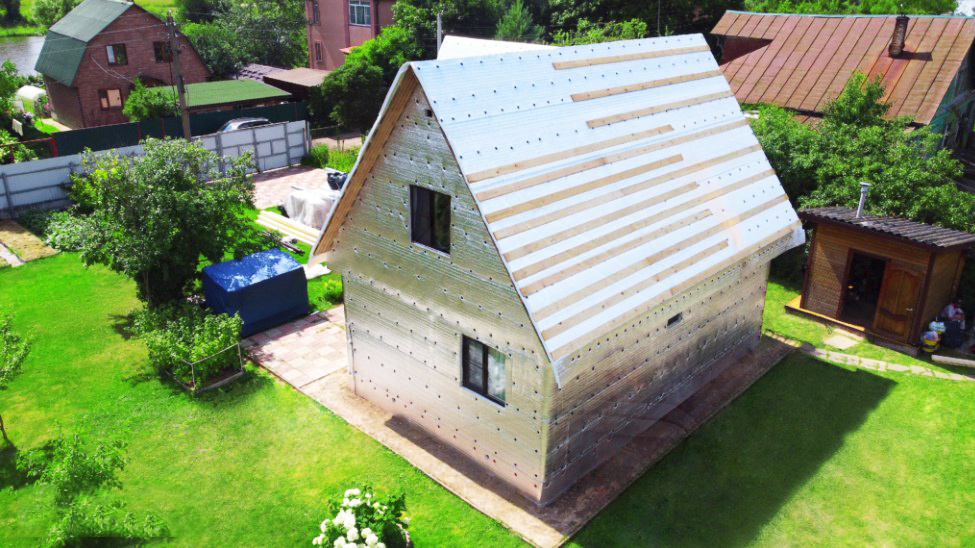 Типовая ситуация: каркасный дом, стены из доски, утепление между стойками выполнено некачественно, углы промерзали, из розеток дуло. Решили утеплять снаружи Тепофолом толщиной 100 мм. Стены обшили полотнами, швы сварили, закрепили тарельчатыми дюбелями. Поверх набили обрешетку и закрыли сайдингом.