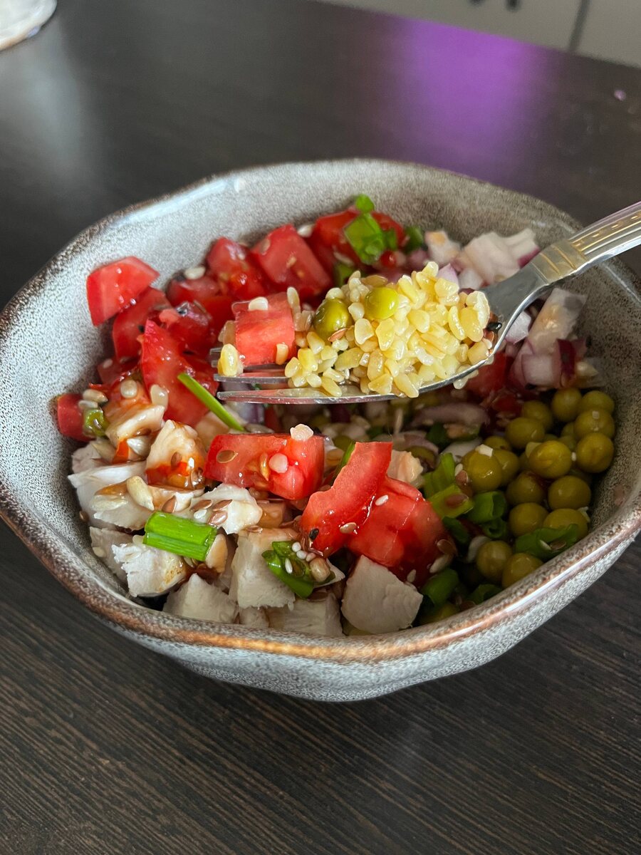 Всё элементарно: углеводы + белок + овощи. Из этого можно собрать что угодно и под настроение и под то, что есть в холодильнике. Сегодня у меня так: • булгур (просто отварила) • курица (готовила в сувиде заранее и достала из морозилки) • овощи: помидоры, зелёный горошек, лук Заправка: соевый соус + сладкий чили. Кстати, сюда отлично зайдёт и ореховый соус, про который рассказывала раньше. Вообще, весь смысл боула в том, что нет строгих правил. Можно менять крупу, белок, овощи, соусы и каждый раз будет новый вкус. Собирается это всё за считанные минуты, а на выходе: • сытно • удобно брать с собой • не надо думать, что приготовить Если хочется чуть разнообразить: добавьте семечки или зелень сверху Простой, вкусный и нормальный по составу обед готов .