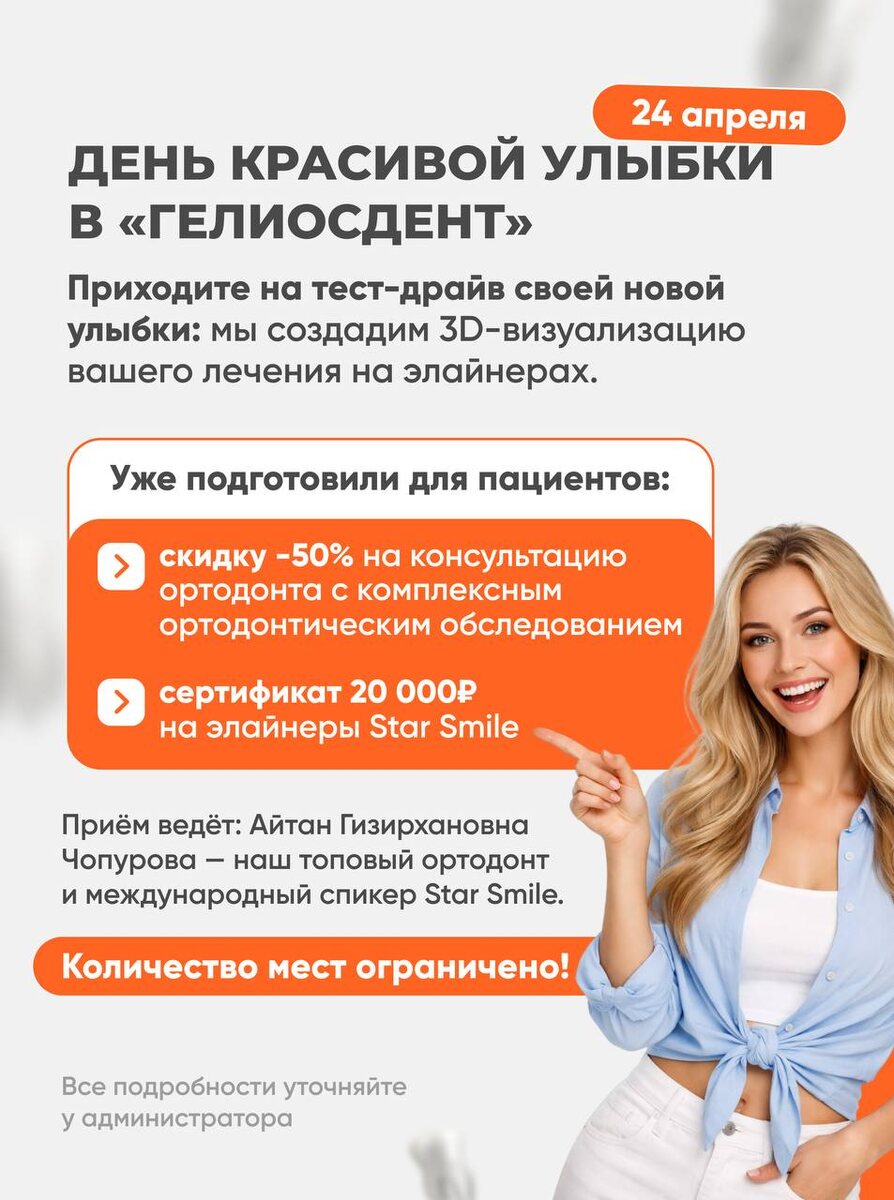 ₽? 🤩 Мы запускаем бронирование мест на День красивой улыбки в «Гелиосдент», который пройдёт 24 апреля! Это ваш шанс познакомиться с топовым ортодонтом и примерить свой будущий результат со скидкой 50% 😍 👉🏻 Предложение действует только для пациентов, кто впервые планирует лечение Отправьте кодовое слово «УЛЫБКА», чтобы занять место на встрече с врачом! 📍 ул. Кузнецова, 3 📍 ул. Победы, 7 📞 +7 (343) 317-33-32
