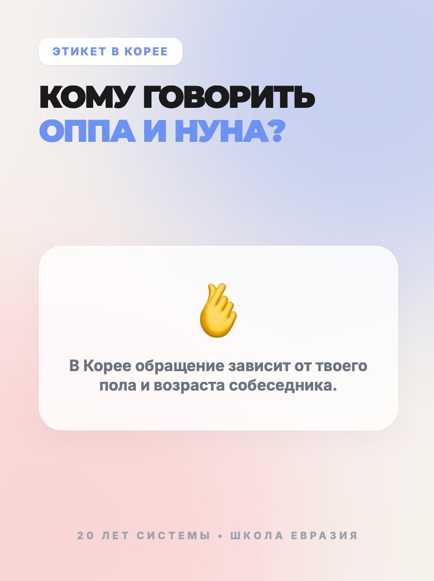 🫰🇰🇷 В Корее нельзя просто подойти к коллеге и сказать: «Эй, Минхо!». Даже если вы друзья, а Минхо старше вас всего на один год — обращение по имени без суффикса будет воспринято как грубость. Корейский язык пропитан уважением к старшим. Это часть ДНК культуры. Чтобы вы не чувствовали себя неловко в Сеуле или при просмотре дорам, мы собрали все основные обращения в одну карусель. Листайте карточки, чтобы запомнить раз и навсегда ➡️ Если вы не уверены, как обращаться к человеку — просто спросите его возраст! В отличие от нашей культуры, в Корее это абсолютно нормальный и даже вежливый вопрос. Более того, скорее всего, кореец сам спросит ваш возраст в первые 5 минут знакомства. Не пугайтесь: он не лезет в личную жизнь, он просто выбирает, какое окончание использовать, чтобы вас не обидеть. 😊 🌸 Подписаться на канал | Дать нам буст | Канал в MAX