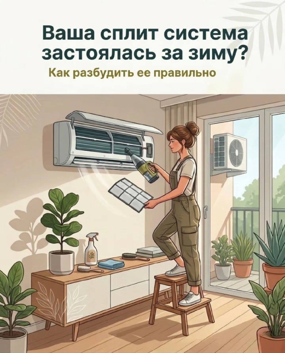 : Вам понадобятся стремянка, пылесос, мягкая тряпка, мыльная вода и антисептик. Перед началом обязательно отключите прибор от сети. Подробная инструкция по этапам — в нашем посте. #кондиционер #обслуживание #чистота #советы #подготовкаксезону
