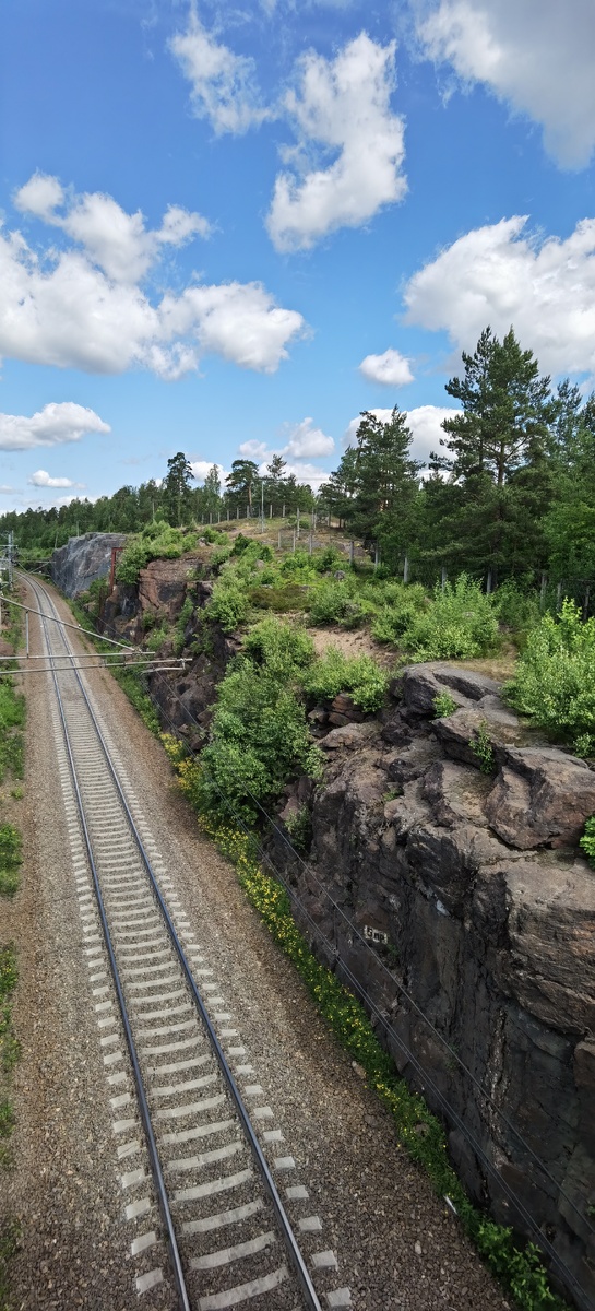 Итак, 4й день я проводил в Выборге. По городу я ориентировался по онлайн-картам, по ним же искал местные достопримечательности. Вот в их числе увидел "парк Монрепо". По расстоянию, как для велосипедиста, совсем рядом. Дай, думаю, заеду. Так что изначально в этот парк заезжать не планировал (ибо вообще о нём не знал) и попал в него, можно сказать, случайно. Дорога туда пролегала по мосту над уходящей на неведомую Финляндию железной дорогой, прорубленной в скалах!