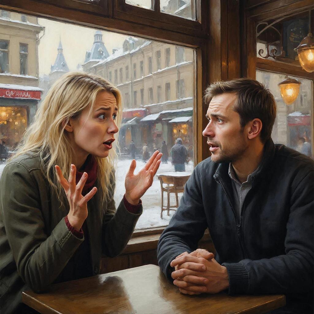 Мир на мгновение замер. Звуки кафе — звон чашек, гул разговоров, музыка — всё отошло на задний план, оставив только эти жестокие слова. В ушах застучала кровь, а перед глазами поплыли тёмные пятна.