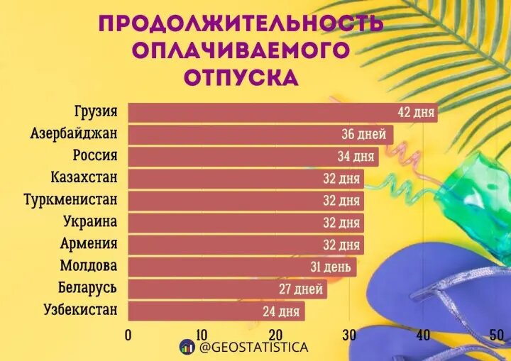Telegram-канал "Геостатистика" сообщил о сравнительном анализе продолжительности оплачиваемого отпуска в странах постсоветского пространства. Согласно приведённым данным, наибольшее количество отпускных дней зафиксировано в Грузии, где продолжительность ежегодного оплачиваемого отдыха составляет 42 дня.