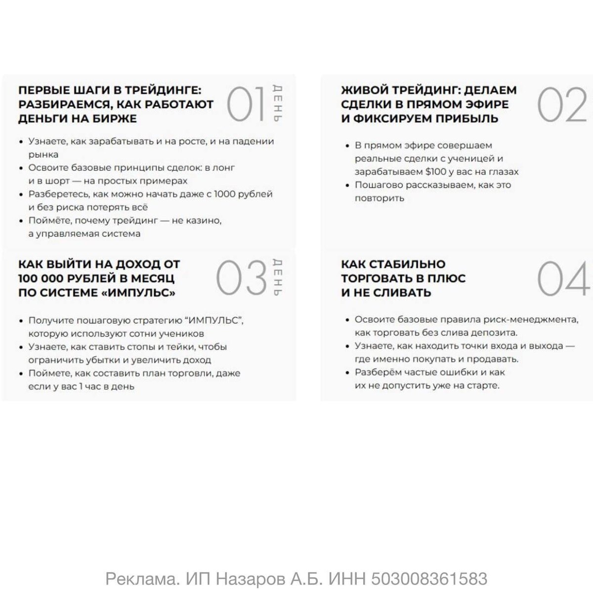 Можно десятками лет наращивать капитал на вкладах или долгосрочных инвестициях, а можно уже сегодня начать зарабатывать на бирже 50-100 тысяч в месяц и растить свой портфель в разы быстрее. И не важно, падает рынок или растет. Артем Назаров за 4 месяца увеличил капитал с 571 тысячи до 30,5 млн рублей через трейдинг. Трейдинг - это не казино, где всё на удачу. Это системная работа с чёткими правилами, где можно начать даже с 10 000 рублей и постепенно наращивать капитал. 📌 За 4 дня бесплатного курса от Артема Назарова с абсолютного нуля получите: — Живую торговлю в прямом эфире: с нуля до первых 5000-10000 рублей на сделке — Стратегию «ИМПУЛЬС» — пошаговый алгоритм для новичков — Понимание, как зарабатывать на росте и на падении рынка — План выхода на доход от 100 000 рублей в месяц 💻 Полностью онлайн и бесплатно, но с поддержкой как на платном курсе 🎁 Зарегистрируйтесь сейчас и получите подарок: "7 ошибок новичкав первую неделю торговли". 👉 Занять место на курсе: tradezonesch