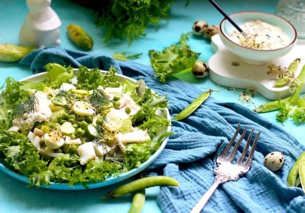 Красивый изумрудный цвет салата – гарантия большого количества калия в блюде, а добавка кальмара обогатит салат чистым протеином. ✔ Кальмары (тушки чищеные) – 300 г; ✔ Сельдерей – 1 черешок; ✔ Огурцы свежие – 200 г; ✔ Рукола или салатный микс – горсть; ✔ Горошек свежезамороженный – 100 г; ✔ Яйцо перепелиное – 4 шт.; Заправка: ✔ Рикотта – 100 г; ✔ Лимонный сок – 1 ст.л.; ✔ Чеснок – 1 зубчик; ✔ Перец черный – по вкусу; ✔ Соус соевый – 1 ст. л. Кальмары очистить от пленок, отварить 1 минуту в кипятке с солью, воду слить, кальмаров охладить и нарезать кубиками или полосками, как вам нравится. Горошек залить кипятком на 5 минут, затем обдать ледяной водой. Яйца отварить и разрезать пополам (если обычное куриное – кубиком). Салат порвать руками. Сельдерей и огурцы нарезать небольшими кусочками или кубиком. Взбить все ингредиенты для заправки. Пробуйте на свой вкус количество соевого соуса, перца, рикотту можете заменить мягким творогом или смешать его с фетой. Выложить на блюдо салатный микс