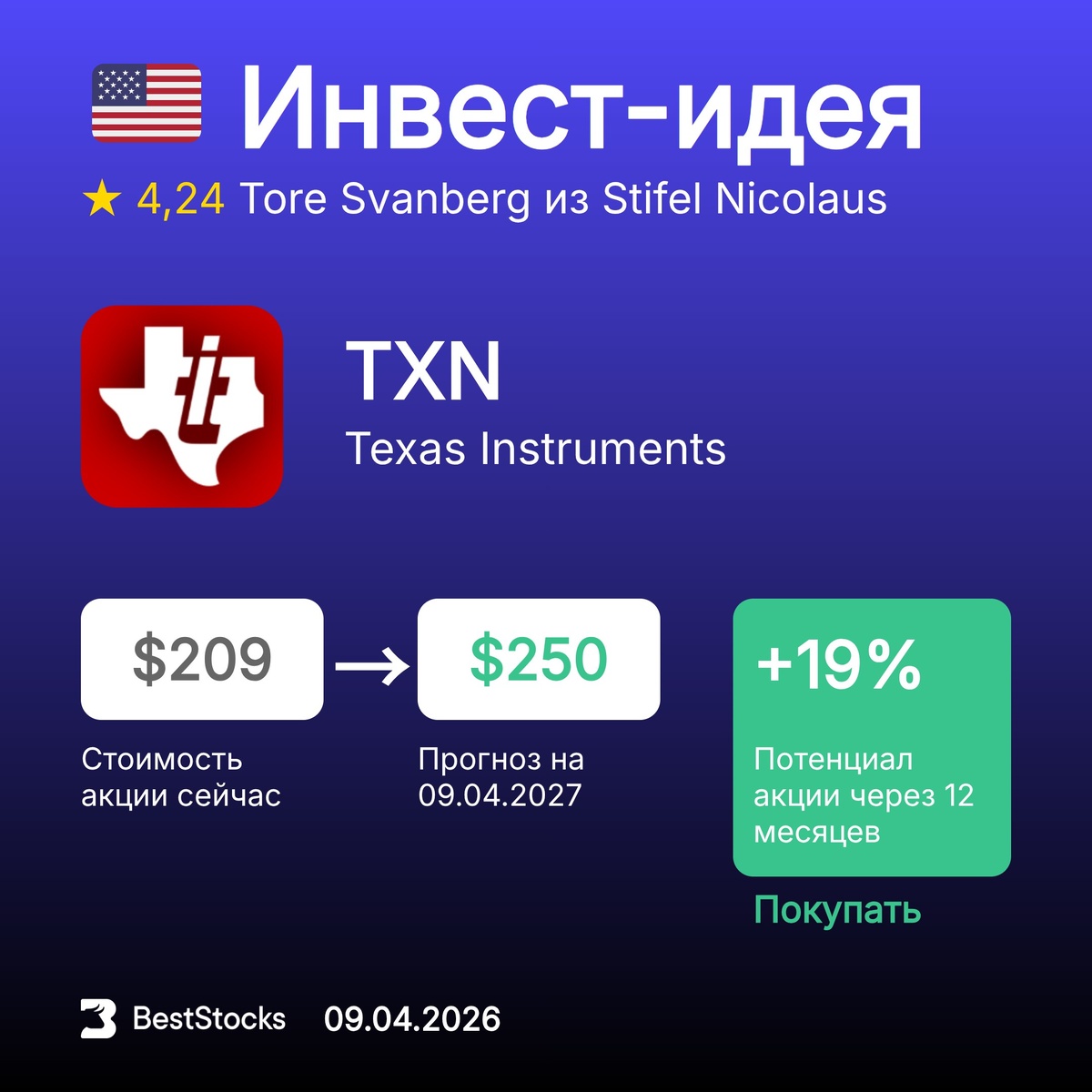 Тикер: TXN Прогнозная цена: $250 (+19%) Рекомендация: Покупать InvestRank акции: 3 из 10 Прогноз сделан: 09.04.2026 Прогноз до: 09.04.2027 Инвест-компания: Stifel Nicolaus Аналитик: Tore Svanberg Ещё рекомендации на сегодня → ••••• 🆕 Новая фича на сайте — Тепловая карта рынка. Вы можете оценить динамику рынка в моменте: какие акции больше всего растут или падают, какие торгуются больше других. Всё это бесплатно и доступно без регистрации. Пользуйтесь!