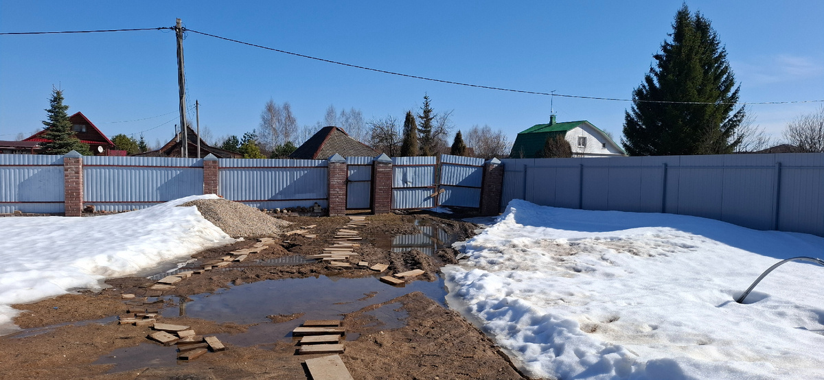- Отсутствие поперечного дренажа. Вода течёт вдоль забора, упирается в столбы ворот и скапливается. Нет трубы, которая перережет этот поток.