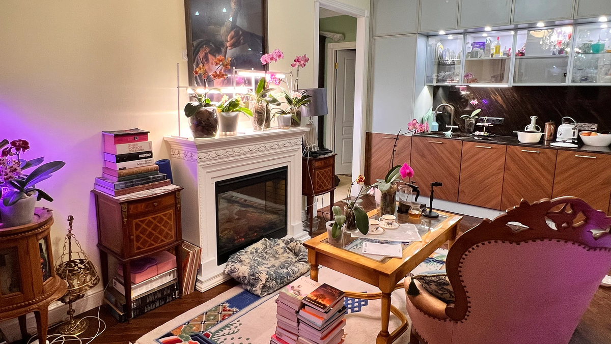 Здесь приятно читать, слушать виниловые пластинки и проводить время наедине с собой. Тут же расположилась тепличка с орхидеями — увлечение, которому я посвятила последние три года жизни. Книги, растения и музыка — лучший способ создать позитивное настроение.