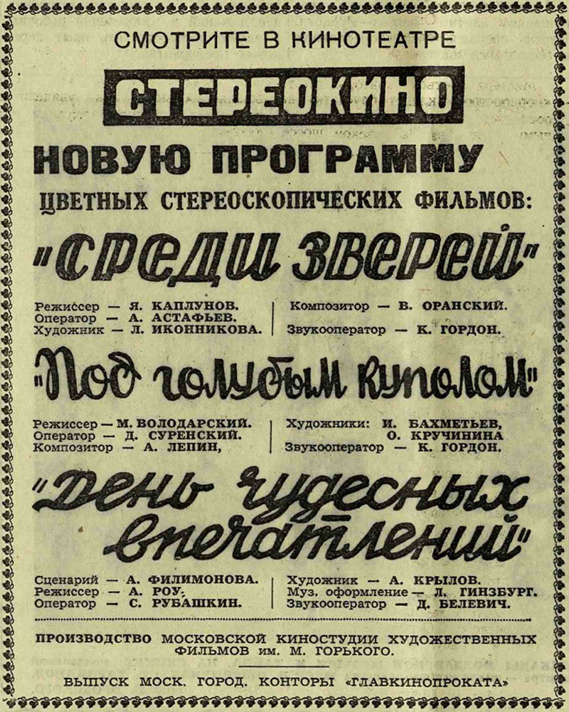 Рубрика "Старости". Газета "Вечерняя Москва", 9 января 1950 года. Среди нашего интерактива есть стереоскоп с картинками, который современные дети называют "советский 3D". И очень часто они удивляются, что это, оказывается, довольно старая технология. А ведь на самом деле стереоскопические фотографии показывали как диковинку на ярмарках ещё в позапрошлом веке, а первый стереоскопический кинотеатр с объемным движущимся изображением построили в СССР ещё в 30-е годы.