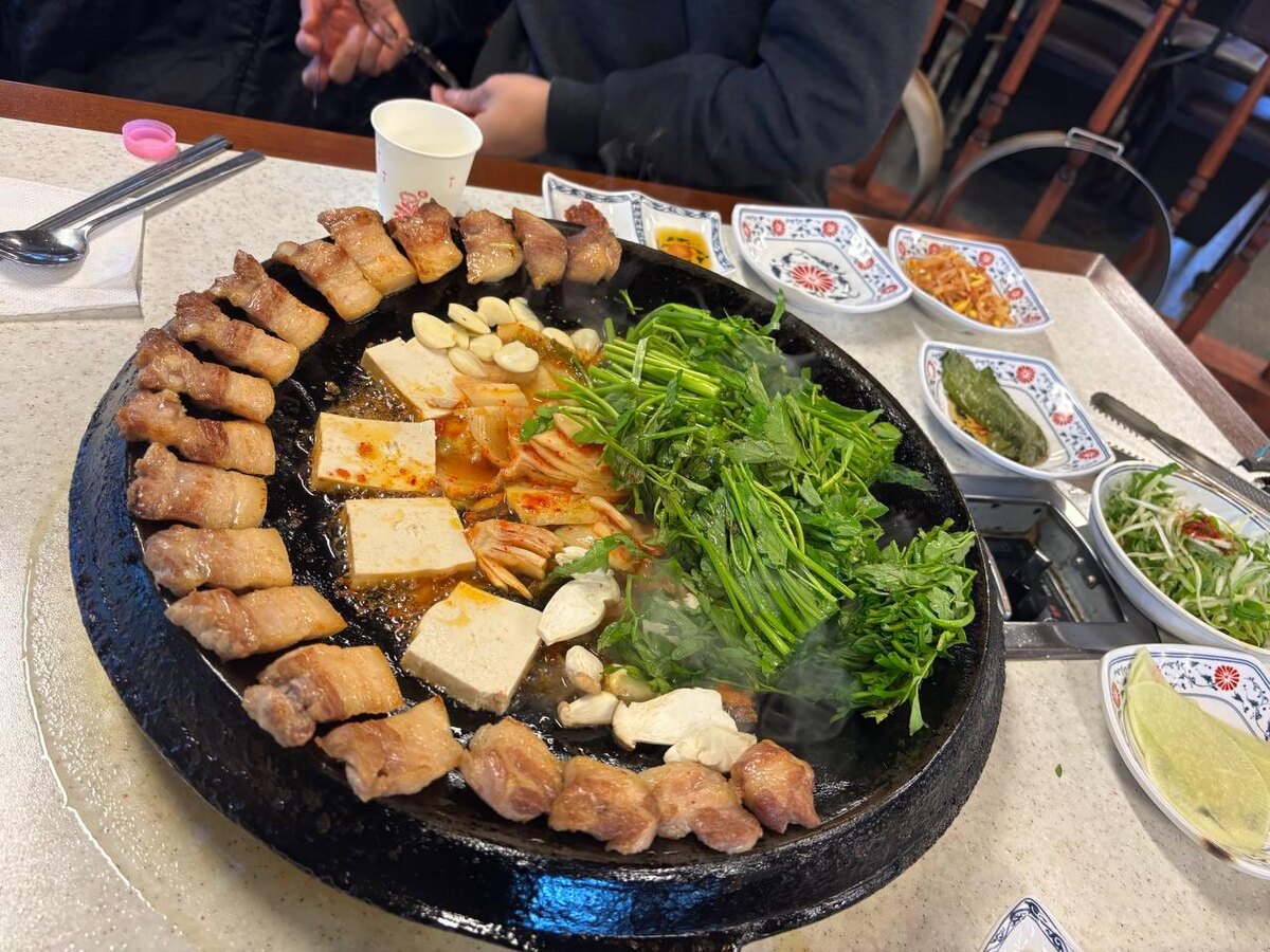 Знакомство с корейской кухней у меня началось с фруктового чая и кимпаба 🍙 И, честно, я вообще не думала, что корейская еда станет одной из моих самых любимых А потом было кимчи-чиге… И всё — назад дороги уже не было Я начала заказывать его почти каждый раз, когда заходила в корейский ресторан Но вот что меня реально удивило в Корее: ЗАВТРАК. Это вообще не «кофе и побежали». Это суп, рис, закуски… Иногда даже мясо. Да, у меня есть коллега, которая спокойно ест самгёпсаль на завтрак. И да — она на диете ОБЕД. Обычно столовая или доширак 🍱 И тут важно доширак — это не лапша быстрого приготовления, а нормальная еда, как дома. Поэтому, собственно, корейская компания Доширак так назвала лапшу, чтобы было ощущение дома) Студенты, кстати, вообще без проблем могут взять и лапшу быстрого приготовления. Это тоже часть реальной жизни здесь. И ещё момент — перекусы Очень часто это максимально простая еда: вареные яйца или сосиски, которые продаются поштучно в круглосуточных магазинах быстро, дёш