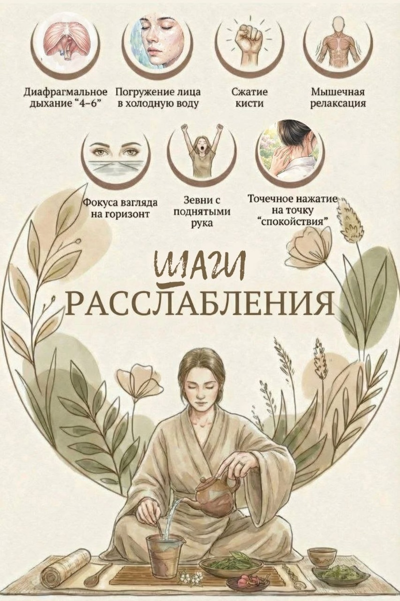 🤩🤩🤩🤩🤩🤩🤩 Свою нервную систему и давление через простые телесные приёмы. 🤩🤩🤩🤩🤩🤩🤩🤩 Эти упражнения воздействуют через вегетативную нервную систему, снижая давление и тревогу. 1. Диафрагмальное дыхание «4–6» Медленный выдох длиннее вдоха (вдох на 4 счета, выдох на 6). Включает парасимпатическую систему, снижает давление и расслабляет за 2 минуты. 2. Погружение лица в холодную воду Нырятельный рефлекс: 15–20 секунд в воду 10–15°C (или холодное полотенце на лицо). Мгновенно замедляет пульс и сужает сосуды. 3. Изометрическое сжатие кисти Сильно сжать эспандер или полотенце в кулак на 30 секунд, затем резко разжать. Выброс адреналина сменяется расслаблением. 4. Мышечная релаксация по Джекобсону Поочередное напряжение (5–7 с) и расслабление всех групп мышц от стоп до лица. Снимает физиологические «зажимы». 5. Сдвиг фокуса взгляда на горизонт Посмотреть вдаль (в окно или на стену) на 2–3 минуты. Разглядывать объекты вдалеке. Расслабляет глазодвигательные мышцы, рефлекторно снижа