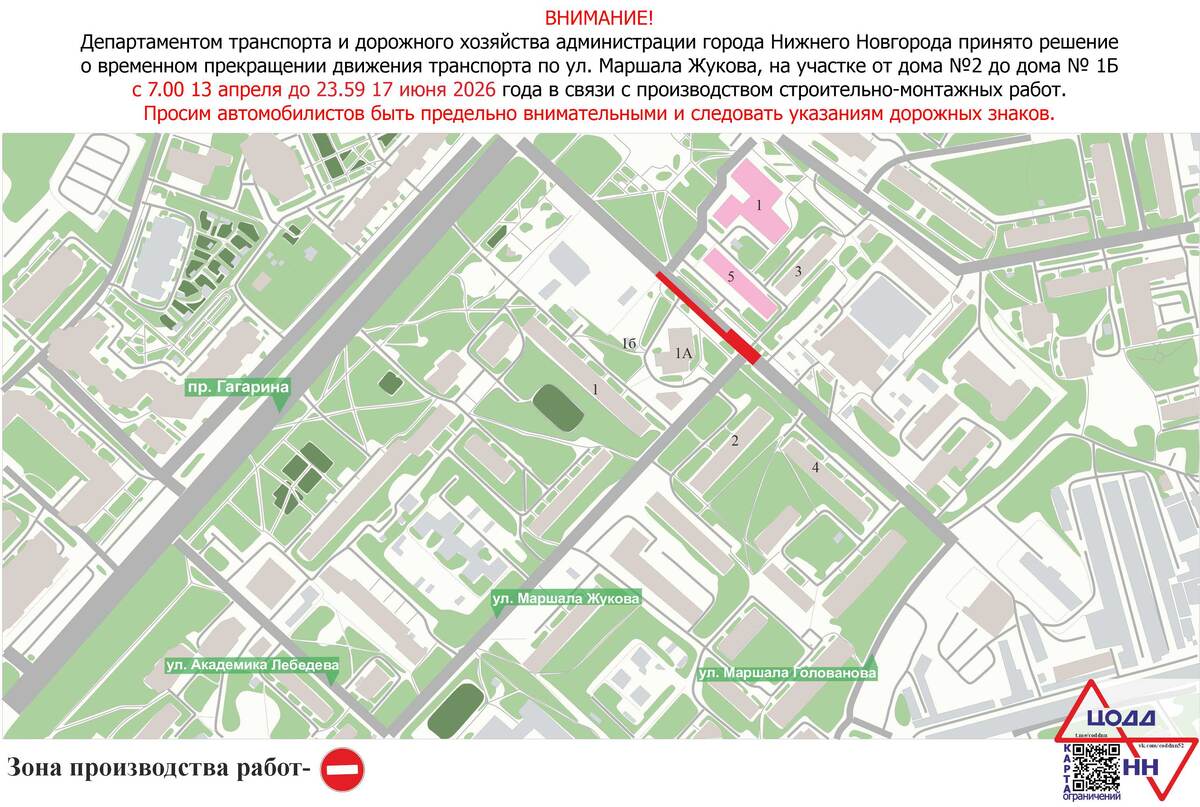 С 07:00 13 апреля до 23:59 17 июня 2026 года в Нижнем Новгороде будет временно ограничено движение транспорта по улице Маршала Жукова на участке от дома №2 до дома №1Б. Ограничения вводятся в связи с проведением строительно‑монтажных работ. Объезд зоны производства работ организован по прилегающим улицам. Водителям рекомендуют заранее планировать маршрут, внимательно следить за изменениями схемы движения и строго соблюдать требования установленных дорожных знаков. Дополнительную информацию можно уточнить в департаменте информационной политики администрации Нижнего Новгорода по телефонам 467‑10‑88, 467‑10‑86. Фото: ЦОДД НН Ранее мы рассказали о том, что в Нижнем Новгороде перекроют центр и Канавинский мост из‑за Крестного хода.