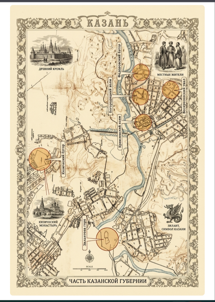 Раньше Казань выглядела совсем не так, как сейчас. В XV веке город делился на две основные части: сам кремль и районы вокруг него. Кремль был главным местом — там жил хан, стояли крепостные стены и находилась защита города. Это был центр всей жизни 👑 Вокруг кремля располагались посады — обычные районы, где жили люди и шла торговля: Интересный факт: Казань часто сравнивают с Римом, потому что город стоит на нескольких холмах ⛰ Город был крупным торговым центром. Отсюда вывозили меха и товары в другие страны — в Москву, Польшу и дальше. Самое оживлённое место было у подножия кремлёвского холма. Там пересекались дороги, ведущие в город. Это место называли «главным перекрёстком» — здесь находились рынки и вход в кремль. Это было настоящее сердце города ❤️ Со временем всё изменилось, но не до конца. Сегодня на месте тех дорог и рынков находятся улицы Баумана и Кремлёвская. Если гулять по центру Казани, можно почувствовать, как город сохранил свою историю. Рельеф, улицы и атмосфера — всё эт