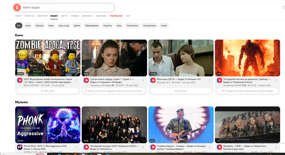 Агрегатор видеоконтента из различных источников (YouTube, VK Видео, OK и других платформ). Единый поиск по миллионам видео, включая фильмы, сериалы, телешоу и пользовательский контент. Функция «Продолжить просмотр» синхронизирует историю между устройствами. Уникальное преимущество — отсутствие необходимости регистрации на множестве платформ для доступа к разному контенту. Структура и категоризация Интерфейс сервиса, представленный на скриншоте, демонстрирует продуманную систему категоризации контента. В верхней части расположены тематические фильтры: «Все», «Кино», «Музыка», «Игры», «Дом и сад», «Детям», «Образование», «Рецепты», «Авто», «Технологии», «Путешествия», «Спорт». Такая структура позволяет пользователям быстро переключаться между интересующими направлениями, не просматривая нерелевантный контент. Раздел «Кино» демонстрирует разнообразие доступного видеоконтента: от анимационных проектов (LEGO-мультфильмы) до полнометражных художественных фильмов и сериалов. Каждая карточка в