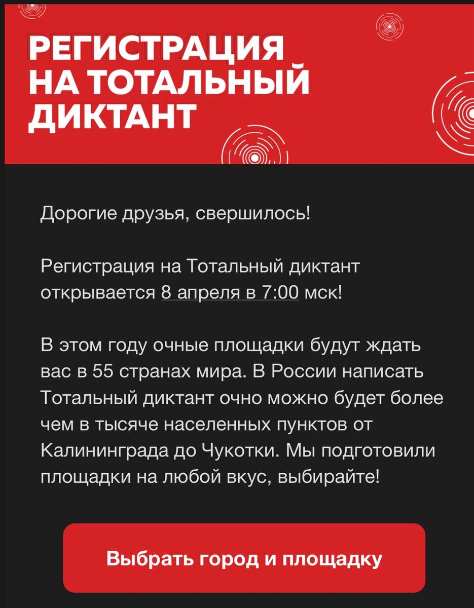А это значит, что приближается ежегодный Тотальный диктант. Регистрация уже открыта, так что можно записываться. Я, кстати, сегодня узнала, что акция проходит не только в России. Несмотря на политическую ситуацию, диктант очно можно написать и в Абу-Даби, и в Праге, и в Осло, и в Нью-Йорке, и еще в куче городов. Нужно только заранее зарегистрироваться на выбранную площадку: https://events.totaldict.ru/venues Ну а я, как обычно, буду писать онлайн) жертва привычки 😜