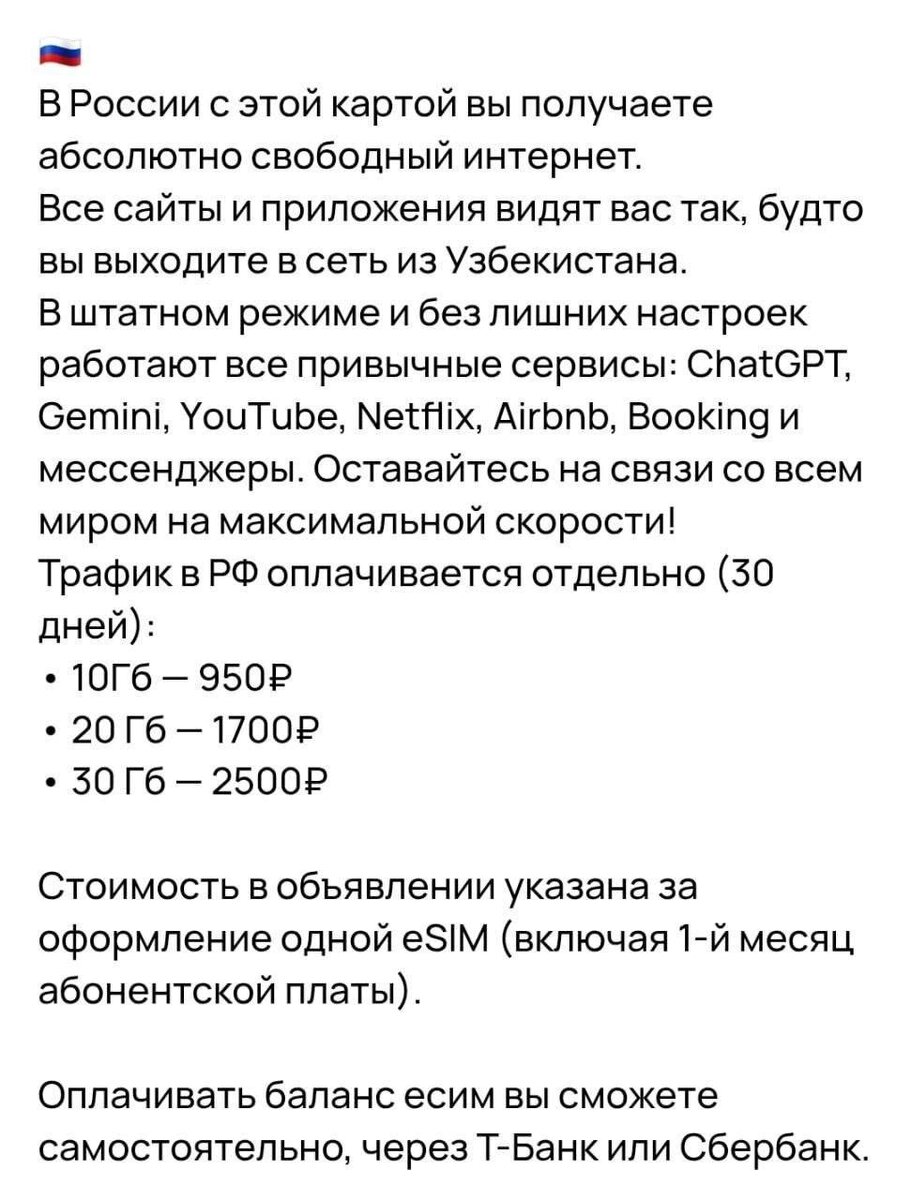 На маркетплейсах уже массово продаются карты из Узбекистана, Казахстана, Таджикистана и Беларуси. С ними интернет идёт через иностранные сети — открываются любые сайты и сервисы. Оплата и активация просты, пополнять можно через обычные банки. NeuroFlux #SIMкарты #eSIM #интернет #Россия #Узбекистан #Казахстан #Таджикистан #Беларусь