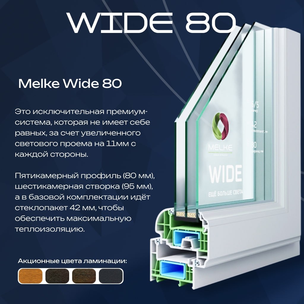 Представляем систему, которая ломает стереотипы о «тяжелых» окнах — Melke Wide 80. Многие боятся, что широкий профиль съест световой поток. С Wide 80 всё наоборот: это самая «светлая» система в своем классе. Почему выбирают Wide 80? 🔹 Максимум солнца: Благодаря инновационной геометрии, высота профиля занижена. Это дает +11 мм светового проема с каждой стороны. В сумме вы получаете значительно больше стекла и естественного света по сравнению с обычными окнами. 🔹 Тепло на уровне профи: Ширина 80 мм и 6 воздушных камер создают непревзойденный барьер для холода. Ваше окно работает как термос. 🔹 Технология CO-EX: Экологичное и сверхпрочное решение. Внутренний слой из рециклингового пластика отвечает за жесткость, а внешний — за ослепительную белизну и гладкость. 🔹 Тишина и уют: Широкий фальц позволяет установить мощный стеклопакет, который превратит шум оживленной улицы в едва уловимый шепот. Идеально подходит для: ✅ Квартир на нижних этажах: Где каждый сантиметр естественного света