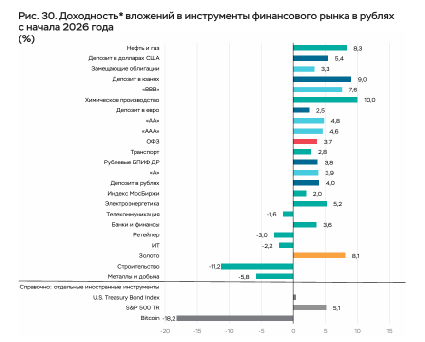 В "Обзоре рисков финансовых рынков" Банк России представил сравнение доходности разных финансовых инструментов за первые три месяца 2026 года.