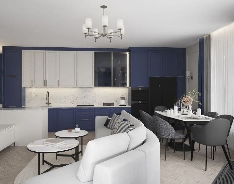 Здесь глубокий синий может быть акцентной стеной, мягкой мебелью или шторами. Молочный — стены, потолок, фасады шкафов. Добавьте латунь или золото — получите роскошь, которая не стареет.