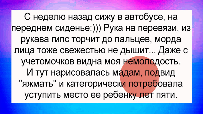 И тут нарисовалась мадам, подвид "яжмать" и категорически потребовала уступить место ее ребенку лет пяти. В полупустом автобусе. Так как она требовала в пространство, я и ухом не повела. Я же на пенсии, какие ко мне претензии могут быть? А нет! И тут слышу: женщина, я к вам обращаюсь!