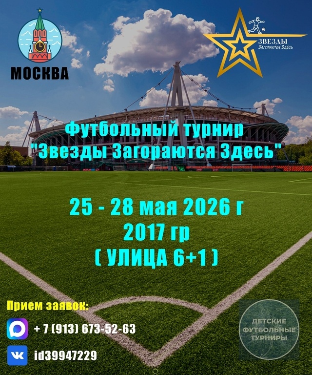 ! 🔥 С 25 по 28 мая 2026 года в сердце России — в легендарной Москве — пройдёт Всероссийский детский футбольный турнир «Звёзды Загораются Здесь» для команд 2017 года рождения! 📍 Место встречи: Москва — город-герой, столица нашей Родины. 📅 Даты турнира: 25–28 мая 2026 года. ⎯⎯⎯⎯⎯⎯⎯⎯⎯⎯ ▌ 🌟 Почему стоит участвовать? - Прямые трансляции матчей — просмотр игры из любой точки страны и поддержка через экран ! - Профессиональный фоторепортаж — яркие моменты останутся с вами навсегда. - Видеоинтервью с игроками и тренерами — расскажите свою историю успеха! - Оригинальные медали на заказ и памятные награды для всех участников. - Бонус для тренера — ваш труд будет отмечен! - Челлендж и номинации — прояви себя не только на поле! - Лучший игрок команды получит специальный приз. ⎯⎯⎯⎯⎯⎯⎯⎯⎯⎯ 💙 Наша оргкоманда не только организует турнир, но и познакомит вас с красотами Москвы, чтобы поездка стала настоящим футбольным праздником! ⎯⎯⎯⎯⎯⎯⎯⎯⎯⎯ 📢 Приглашаем всех принять участие! ✨ «Звёзды Заго