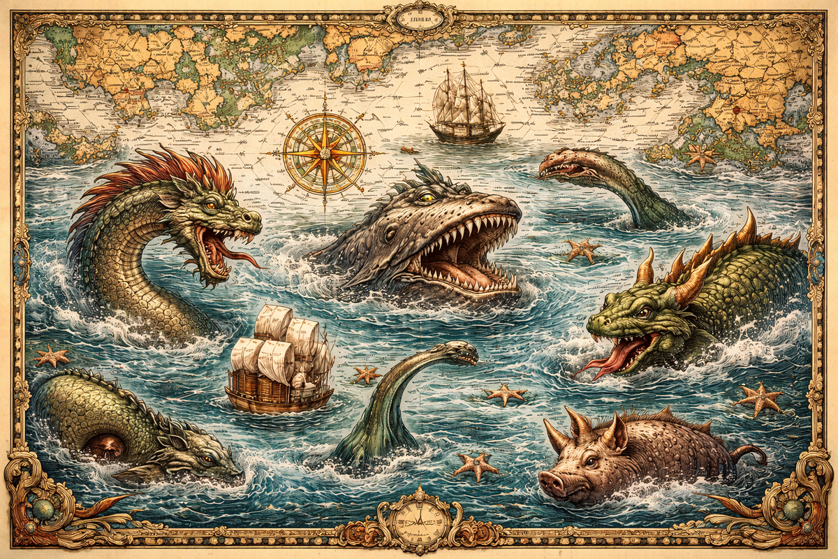Они напоминают, что когда-то даже серьёзное знание говорило не только через цифру и линию, но и через образ. Там, где сегодня мы ставим координаты и глубины, люди прошлого рисовали чудовище. Не потому, что были глупее, а потому, что мир для них действительно оставался менее понятным, менее измеренным и гораздо более пугающим.
