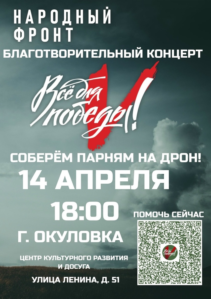 🎙14 апреля в 18:00 в Центре культурного развития и досуга «Окуловка» пройдет благотворительный концерт «Всё для Победы