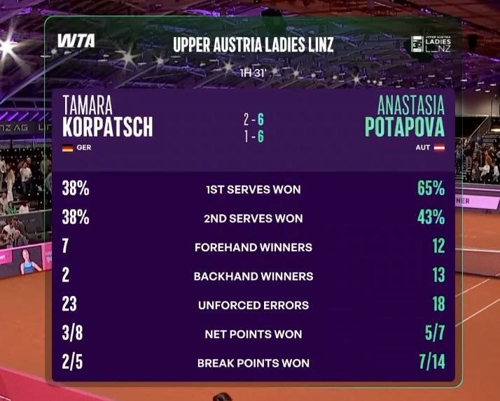 ⚡ WTA 500 Linz R2: A. Potapova def. [Q] T. Korpatsch 6-2, 6-1