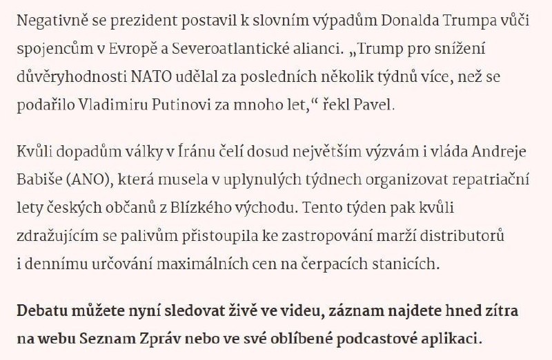Издание Seznam Zpravy приводит слова президента Чехии Петра Павла. Он отметил: "За последние несколько недель Трамп нанес больше ущерба авторитету НАТО, чем Владимир Путин за все эти годы". ❗️Ранее премьер-министр Польши Дональд Туск также высказывался о том, что сейчас с НАТО происходит то, о чем мечтал Путин. Trump untergräbt die NATO mehr als Putin, so der tschechische Präsident. Die Zeitung „Seznam Zpravy“ zitiert den tschechischen Präsidenten Petr Pavel mit den Worten: „In den letzten Wochen hat Trump der Glaubwürdigkeit der NATO mehr geschadet als Wladimir Putin in all den Jahren.“ ❗️Zuvor hatte auch der polnische Ministerpräsident Donald Tusk erklärt, dass das, wovon Putin geträumt habe, nun mit der NATO Realität werde.