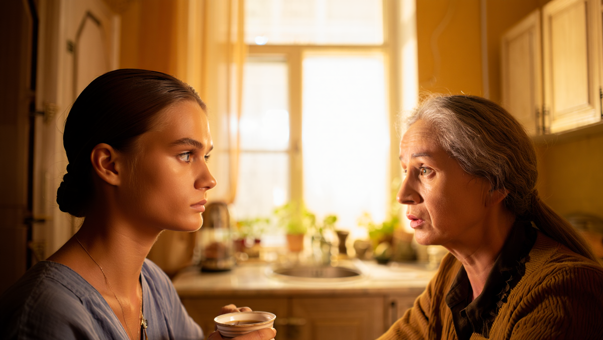 Свекровь сиделки за столом — прямая, подвижная, с чашкой чая в руках. Лицо у Тамары Ивановны было именно такое, будто она только что услышала что-то глубокое оскорбительное. Она поджала губы. Прикрыла глаза. Потом тяжело, с чувством, смотрела.