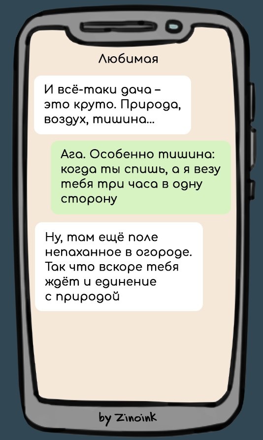Вот и наступила настоящая весна, а это значит, что мы открываем сезон охоты на сорняки и серийное выращивание кабачков! Желаю всем садоводам: чтобы жук был колорадским только по паспорту, чтобы дождь шел только тогда, когда вы уже уехали в город, а шашлык получался таким, что у соседей текли слюнки от зависти! Сегодня я собрал 9 смешных переписок про сборы на дачу. Уверен, они тебе понравятся! Приятного чтения и не забывай подписываться на меня теперь и в MAX! Зимой дачник вспоминает лето как райский уголок с шашлыками и гамаком. Летом дачник вспоминает зиму как время, когда не надо ничего полоть, косить и собирать. Кажется, герой следующей переписки относится ко второй категории – в любой сезон! В марте в магазинах для сада происходит массовое помешательство: люди с остекленевшими глазами скупают семена, глядя исключительно на картинки, и свято верят, что у них вырастет точно такой же ананас, как на упаковке). В тему подготовки к дачному сезону – следующая переписка. Подготовка к сезо