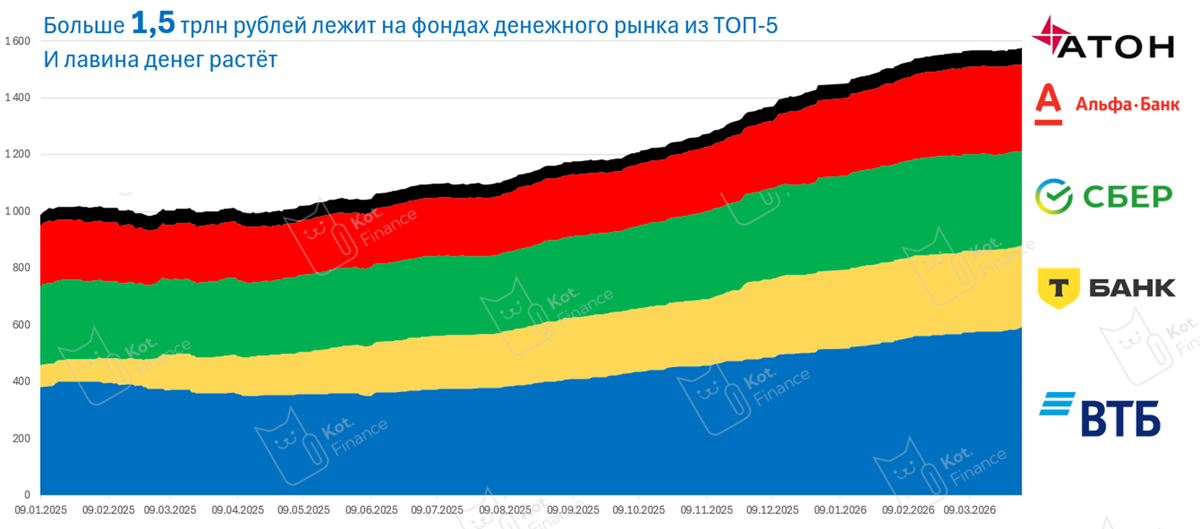 Нас легко найти в Телеге: @mkot_finance❗️Не работает TG? Коты везде! 👈Читай нас, где удобно! Ранее мы развенчивали мифы фондов денежного рынка, и LQDT в частности: самый надежный? самый ликвидный? самый доходный? (из равных по риску, разумеется). Недавно разбирали, как легко обыграть денежный рынок. Быстрый ответ – или ультра-короткие, или флоатеры Мы пробежались по самым большим фондам: LQDT, TMON, SBMM, AKMM, AMNR от АТОН. В сумме у них на счетах лежит больше 1,5 трлн рублей. Но учитывая разницу в доходности с ключевой ставкой, не похоже, что пайщики держат деньги там годами. Зачем? Ведь любой флоатер даст больше На наш взгляд, разумное управление предполагает использование фондов ликвидности – как временная парковка денег. Но что ждут эти деньги? Куда они пойдут? В акции, или бонды? У нас нет ответа, как и вряд ли существует соц.опрос среди владельцев фондов ликвидности. В наших стратегиях мы паркуем в ликвидности или сумму, меньше полного лота облигации (до 1-2% портфеля в зависи