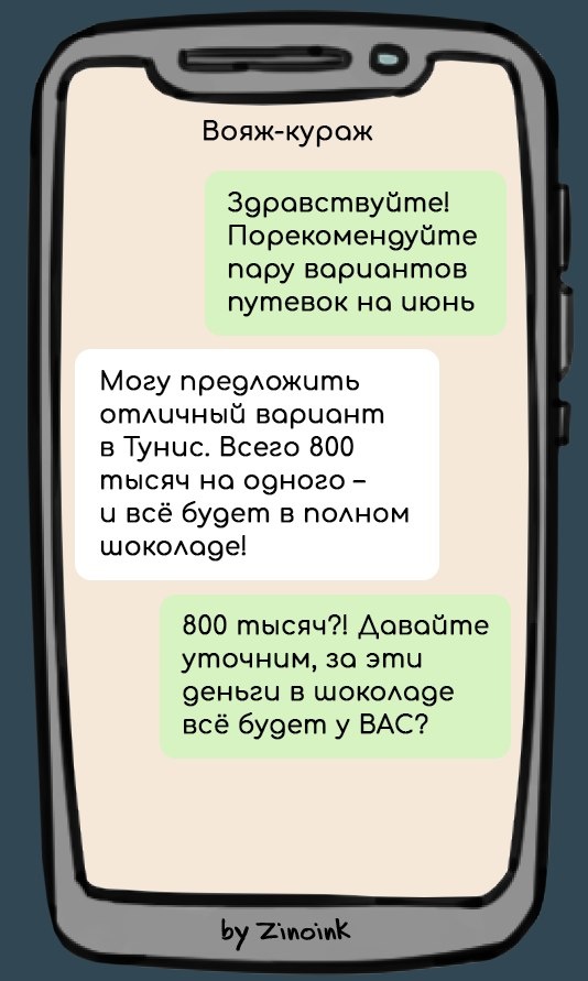 Впереди лето, а значит многие будут планировать отпуск. Самый лёгкий вариант – это взять путевку через туроператора. Тогда не нужно вообще париться об организации. Но лично я давно так не делаю. Потому что со временем понял – любой туроператор работает по простому принципу: вы платите ему деньги, чтобы он превратил ваше представление об отпуске в его представление о том, чего вы заслуживаете). Сегодня я собрал 9 переписок с туроператорами, в которых люди недовольны отпуском. Уверен, они вам понравятся. Приятного чтения и не забывай подписываться на меня теперь и в MAX! Кажется, что в современном мире просто глупо ездить в отпуск заграницу, тратя баснословные деньги за путевку. Но я в том году рискнул! Самое дорогое в этом отпуске оказалась моя уверенность, что в следующем году я поеду на дачу. А дача теперь кажется мне инвестиционно привлекательным стартапом!) В тему – следующая переписка. Не знаю, как ты, а я ненавижу активный отдых. Если когда-нибудь я и начну заниматься дайвингом,