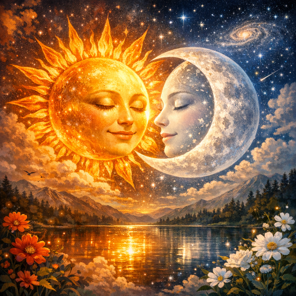 В мифах Солнце и Луна редко бывают просто «лампочками на небе». Это персонажи с характером, ревностью, долгом. Их изображение рядом часто означает союз — иногда добровольный, иногда вынужденный.