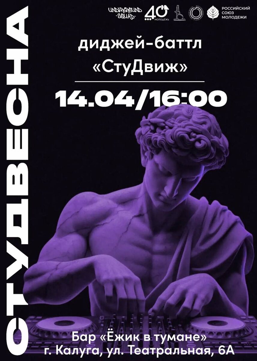 ! ⚡️ Приглашаем вас на отборочный этап инструментального направления «Калужской студенческой весны» в номинации «Электронная музыка и диджеинг» ⭐️ Вместе откроем для себя ярких талантов и погрузимся в ритмы современной музыки! Встречаемся 14 апреля в 16:00 по адресу: г. Калуга, ул. Театральная, д. 6А. 👉 Не забудьте зарегистрироваться по ссылке: https://myrosmol.ru/events/bb0924ba-5c94-45ec-83a5-9d00fbab512e Вход свободный. Количество мест ограничено. #Молодёжь40