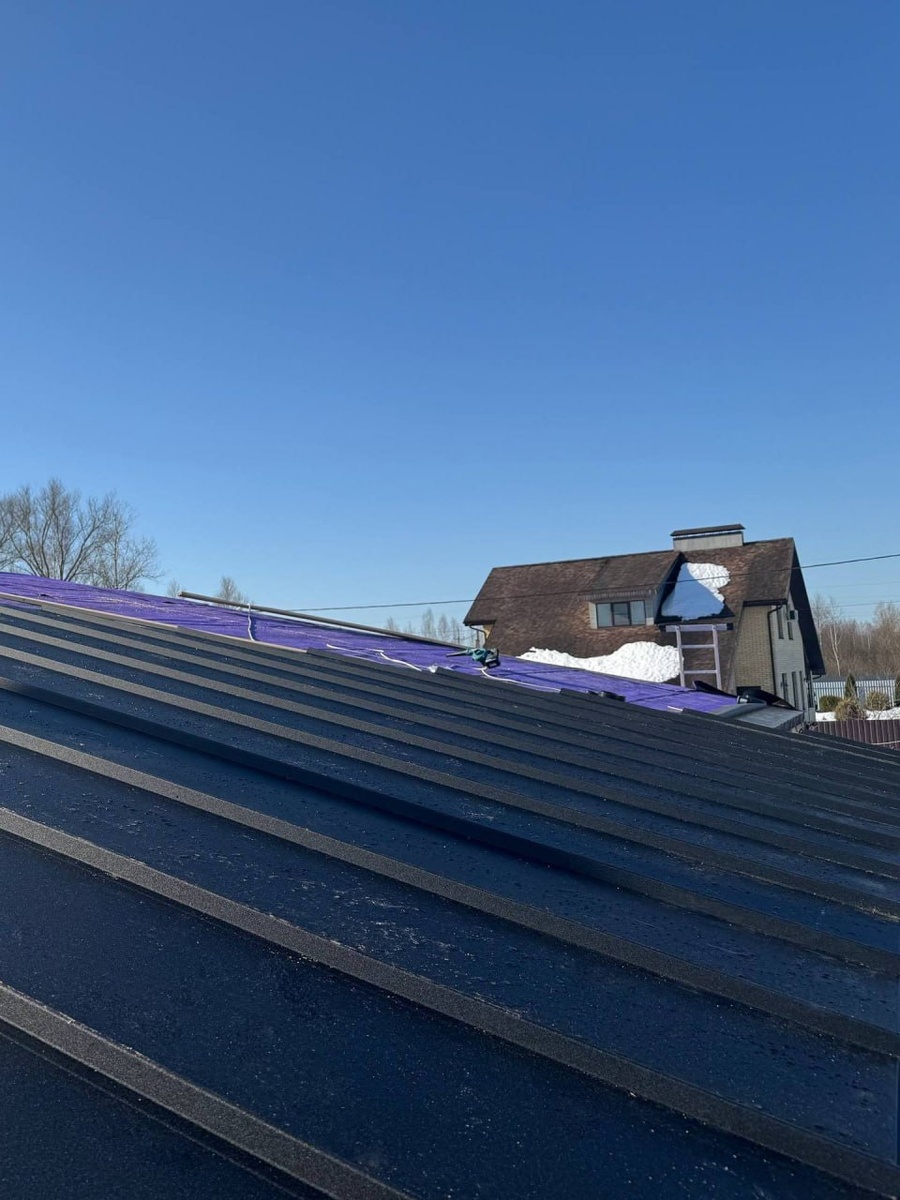 ? Это наша бригада в Рыбинске приступила к монтажу кровельного покрытия. На фото фиолетовый подкладочный ковер, один из ключевых слоёв кровельной системы. Она защищает конструкцию от влаги и конденсата. На объекте выполняем монтаж кликфальца от Grand Line: выбрали металл толщиной 0,5 мм, чёрный цвет с покрытием Drap. Это решение сочетает в себе аккуратный внешний вид и высокую надёжность — за счёт герметичных соединений и устойчивости к внешним воздействиям. Если планируете строительство дома — напишите нам в личные сообщения, подберём оптимальное решение под ваш проект 📩