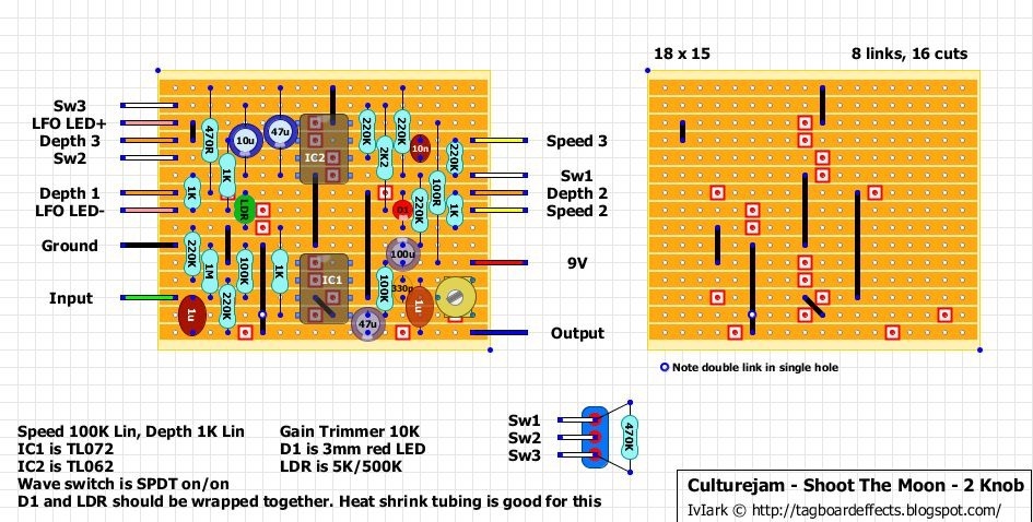 3. Форма волны (Wave switch): Уникальная фишка. Переключатель Sw3 (SPDT on/on) меняет форму огибающей. В одном положении — плавная синусоида, в другом — более резкая, треугольная или асимметричная, что дает эффект «дрожания».