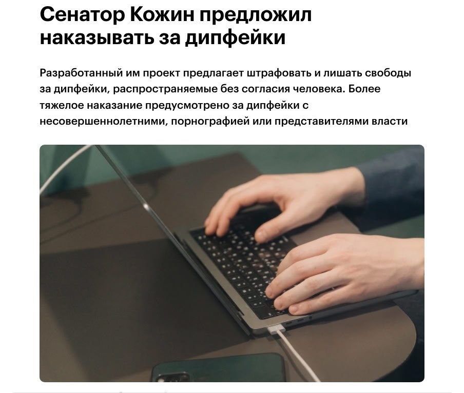 Разработанный им проект предлагает штрафовать и лишать свободы за дипфейки, распространяемые без согласия человека. Более тяжелое наказание предусмотрено за дипфейки с несовершеннолетними, порнографией или представителями власти. За незаконное создание и использование дипфейков сенатор предложил ввести наказание: если это причинило существенный вред правам и законным интересам потерпевшего (моральный вред, вред деловой репутации, ограничение в правах, существенное нарушение частной жизни и т.п.) — штраф до 500 тыс. руб. или зарплата осужденного за период до шести месяцев либо обязательные работы до 480 часов, либо исправительные работы до одного года, либо ограничение свободы до двух лет; ....... если те же действия совершены в отношении представителей власти при исполнении; в целях провокации особо тяжкого преступления — лишение свободы от трех до семи лет. За невыполнение обязанности по удалению или блокировке дипфейка для владельцев сайтов или провайдеров хостинга предлагается в