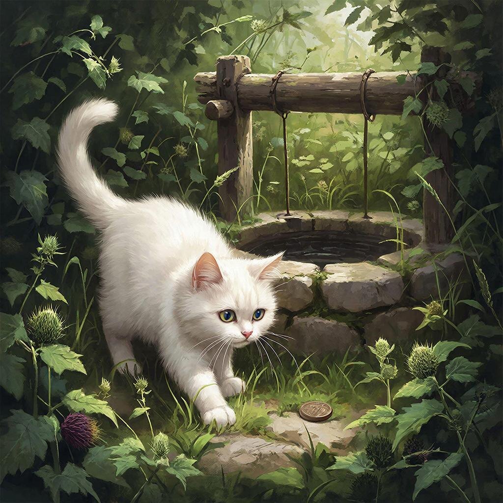 Однажды, когда солнце только поднималось над горизонтом, Маруся отправилась на свою обычную утреннюю прогулку. Вдруг её внимание привлекло что-то блестящее в траве. Кошка осторожно подошла, принюхалась и лапкой вытащила из земли небольшую круглую вещицу. Это была древняя монетка, покрытая патиной времени, с едва различимым узором.