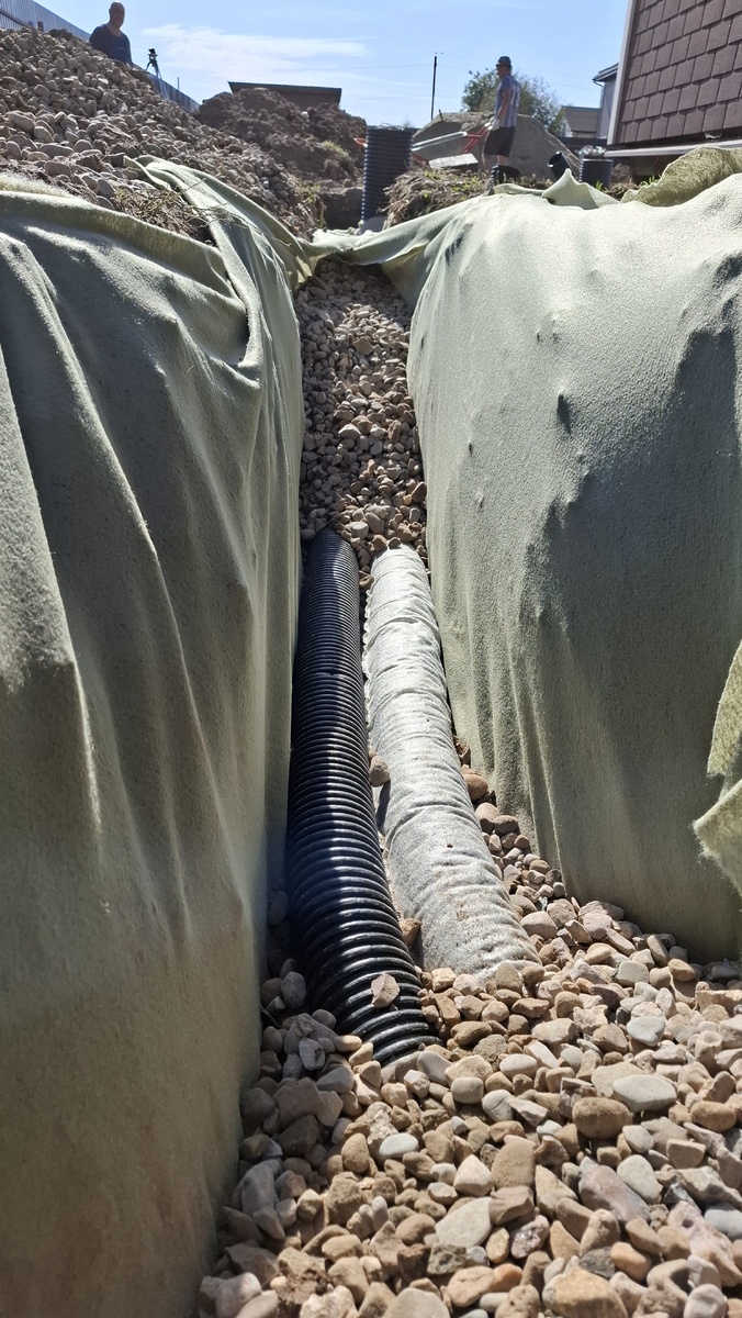 🔴 Геомембрана вместо геотекстиля в дренаже. Вода не попадает в трубу, система не работает. Дренаж с «барьером» = деньги на ветер.