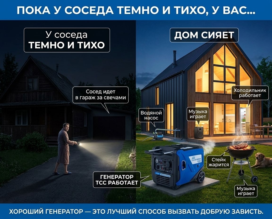 ! ☀️🔌 Знакома ситуация? Вы на даче, готовите шашлык, играет музыка — и вдруг… свет гаснет. Ни света, ни холодильника, ни чайника. Знакомо? Пора положить конец капризам электросети! Генератор ТСС — это ваш надёжный запас энергии для любых ситуаций. Почему именно ТСС? ✅ Надёжность. Работает стабильно даже в сложных условиях — и в жару, и в холод. ✅ Экономичность. Оптимальный расход топлива: хватит надолго без лишних затрат. ✅ Тихая работа. Не помешает отдыху и не разбудит соседей ночью. ✅ Простота использования. Запускается легко — справится даже новичок. ✅ Универсальность. Подключит всё: от лампочки до электроинструмента. ✅ Компактность. Не займёт много места на участке или в гараже. ✅ Гарантия качества. Продукция проверенного бренда с сервисной поддержкой по всей стране. Генератор ТСС — не просто техника. Это спокойствие за семью, комфорт в быту и гарантия, что отдых не прервётся из‑за отключения электричества. 💡 Подарите своей даче надёжного «энергетического помощника» — выбер