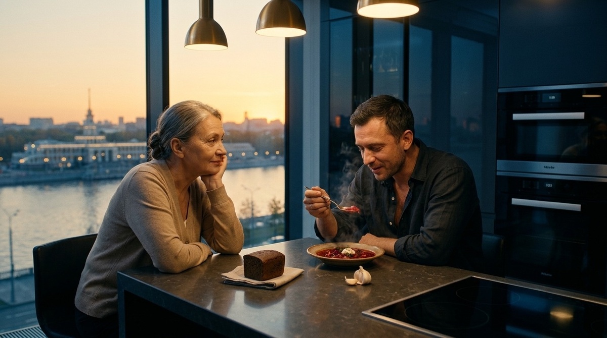 На кухне было стерильно, как в операционной. Елена Петровна достала из сумки пакеты. Она двигалась осторожно, боясь оставить след на полированном камне столешницы. Через час по квартире поплыл аромат, который невозможно было купить в ресторане или заказать с курьером — густой, дразнящий запах настоящего борща на косточке, с чесночком и томленой свеклой.