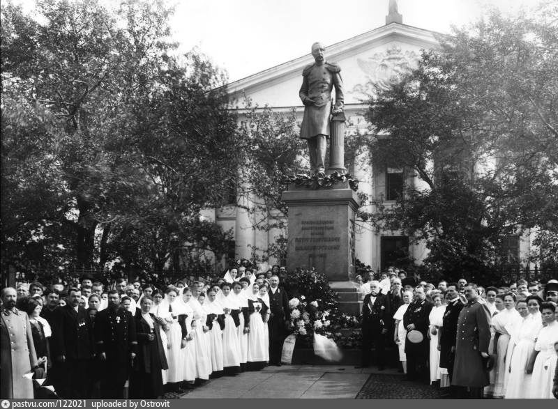 Памятник Его Императорскому Высочеству принцу Ольденбургскому, внуку Павла I, широко известному благодаря своей обширной благотворительной деятельности был торжественно открыт 17 июня 1889 года у Мариинской больницы. Скульптор И.Н. Шредер, арх А.О. Томишко, отлит в бронзе был на фабрике К. Берто в Петербурге. Командовал парадом в честь открытия вел. кн. Сергей Александрович. Из Аничкова дворца прибыли Государь император и Государыня императрица. В 1912 г. в связи со столетием со дня рождения принца П.Г.Ольденбургского постановлением Городской Думы набережную реки Фонтанки от Училища правоведения до Пантелеймоновского моста переименовали в «Набережную принца Ольденбургского». В 1930 году, памятник был снесен и отправлен на переплавку. А место в 1932–1933 годах заняла чаша со змеей. Которую помнят Ленинградцы. Большая бронзовая змея, тело которой покрыто мелкой чешуей, обвив хвостом подставку и плавно изгибаясь, склонилась над чашей. Эта эмблема медицины была отлита в 1932–1933 годах